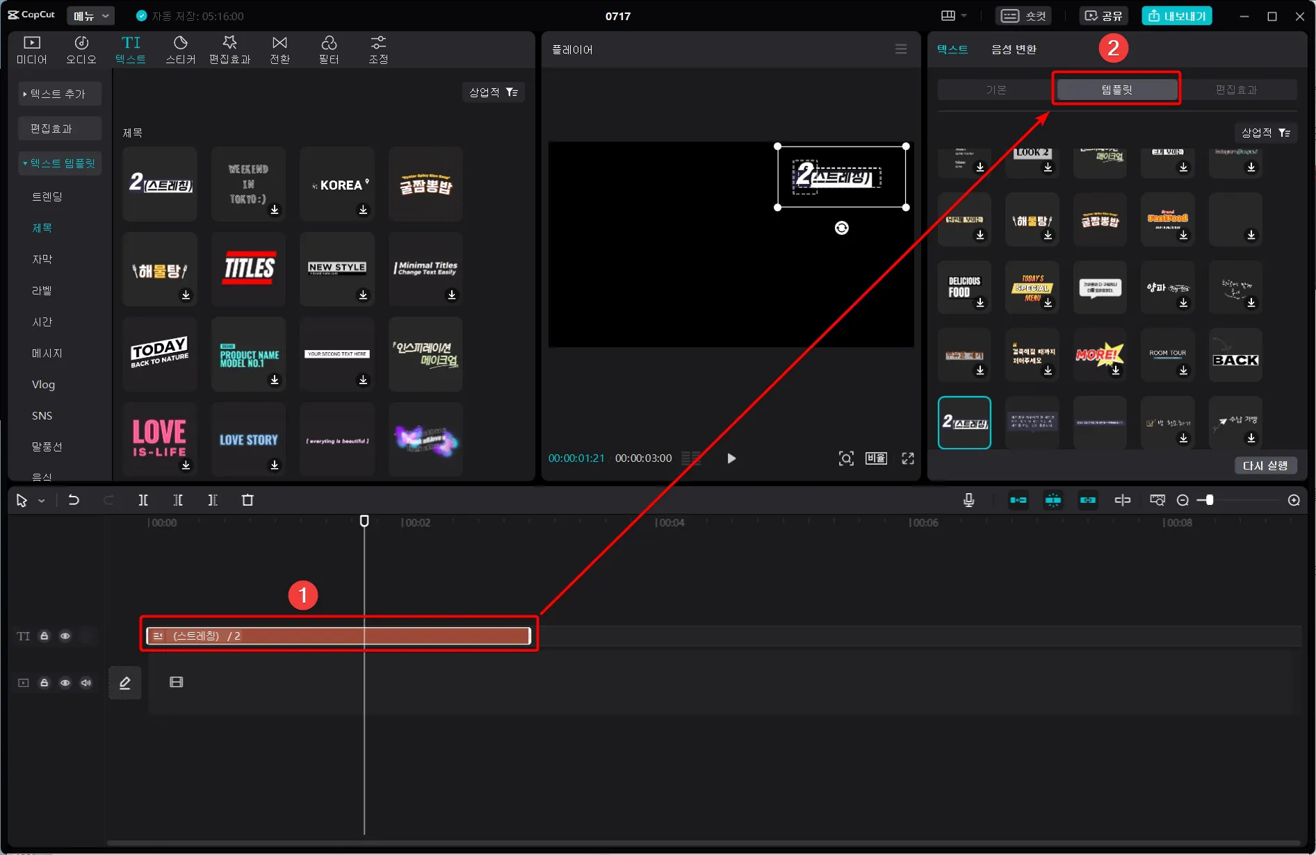 타임라인에 있는 템플릿을 선택하면 프로그램 우측 상단에 있는 메뉴가 활성화되는데 [템플릿] 탭을 선택하면 좌측에 있는 텍스트 템플릿과 동일한 템플릿 목록이 나옵니다. 이곳에서 템플릿을 선택하면 타임라인의 템플릿이 다른 템플릿으로 변경됩니다.
