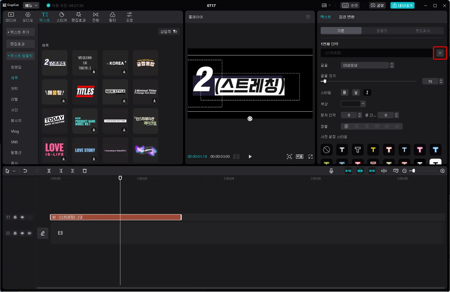 타임라인에 추가한 텍스트 템플릿이 마음에 들지 않는다면 삭제하고 다른 템플릿을 추가해도 되지만, 간단하게 다른 템플릿으로 변경이 가능합니다.