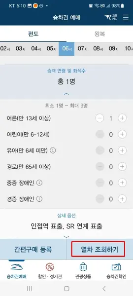 - 기차를 타고 가려는 날짜와 시간, 인원수 등 선택하고 "열차 조회하기" 클릭