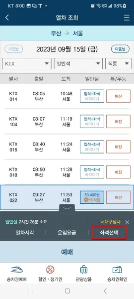 - 기차 시간표를 확인하고 타고 가려는 기차 및 좌석 선택하고 "예매" 클릭