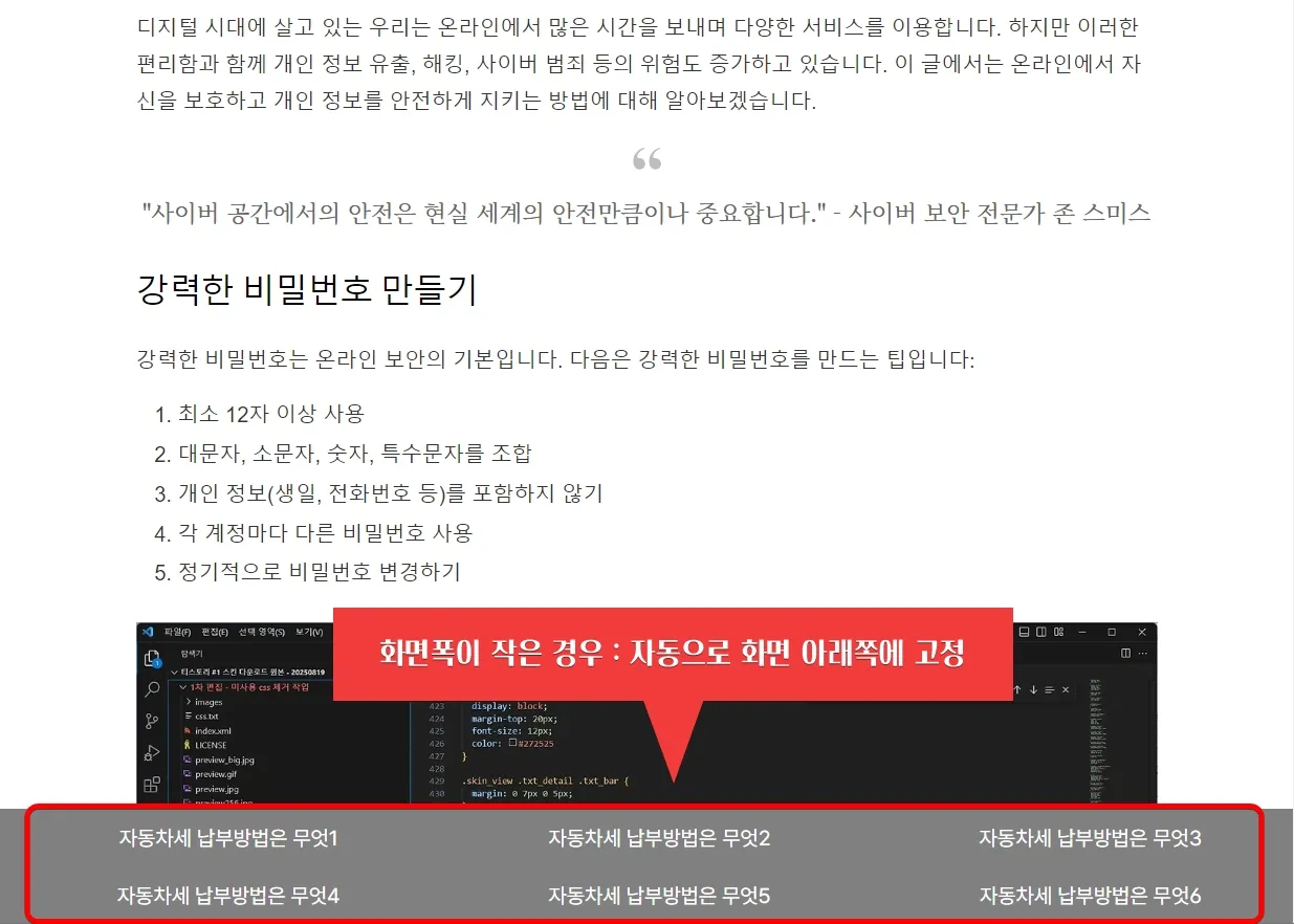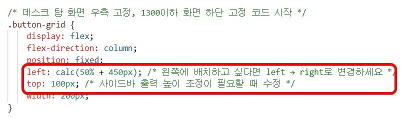 - 기존 코드가 끝나는 지점 아래에 다운로드한 파일에 있는 /* 데스크톱 화면 우측 고정, 1300 이하 화면 하단 고정 코드 시작 */부터 /* 데스크톱 화면 우측 고정, 1300 이하 화면 하단 고정 코드 끝 */의 내용을 복사 붙여 넣기.