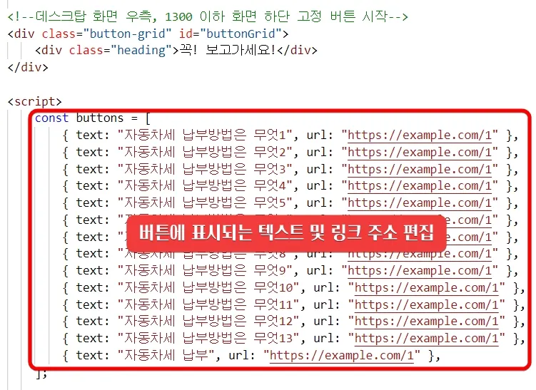 버튼에 표시되는 텍스트 및 링크 주소를 수정하려면, 방금 붙여 넣은 html 코드를 아래의 그림을 참고해서 변경하시면 됩니다. 편집 작업이 서툰 분은 별도의 메모장을 이용해서 편집한 다음 다시 붙여 넣기 해주세요.