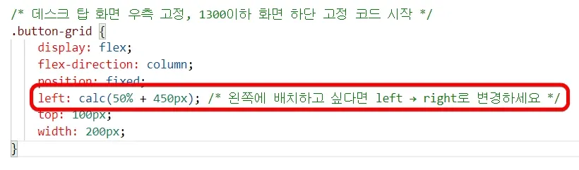 현재 기본 설정은 본문 오른쪽에 나타나도록 되어 있습니다. 본문 왼쪽으로 이동시키려면 아래 그림을 참고해서 button-grid에 있는 left: ~ 되어 있는 코드를 right로 수정해 주세요.
