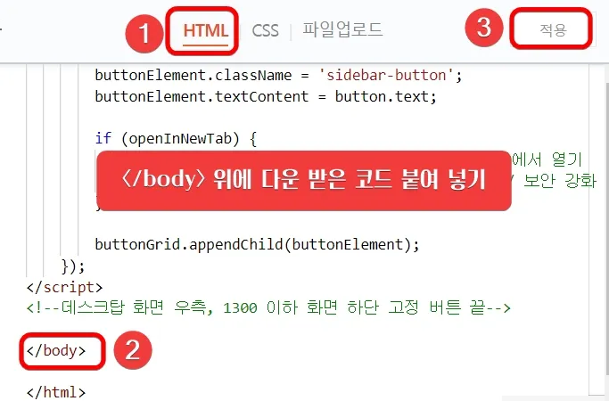 - HTML 코드 가장 하단부에 있는 </body>를 찾아주세요. </body> 위에 다운로드한 파일에 있는 <!-- 데스크톱 화면 우측 고정, 1300 이하 화면 하단 고정 코드 시작 -->부터 <!-- 데스크톱 화면 우측 고정, 1300 이하 화면 하단 고정 코드 끝 -->의 내용을 복사 붙여 넣기.