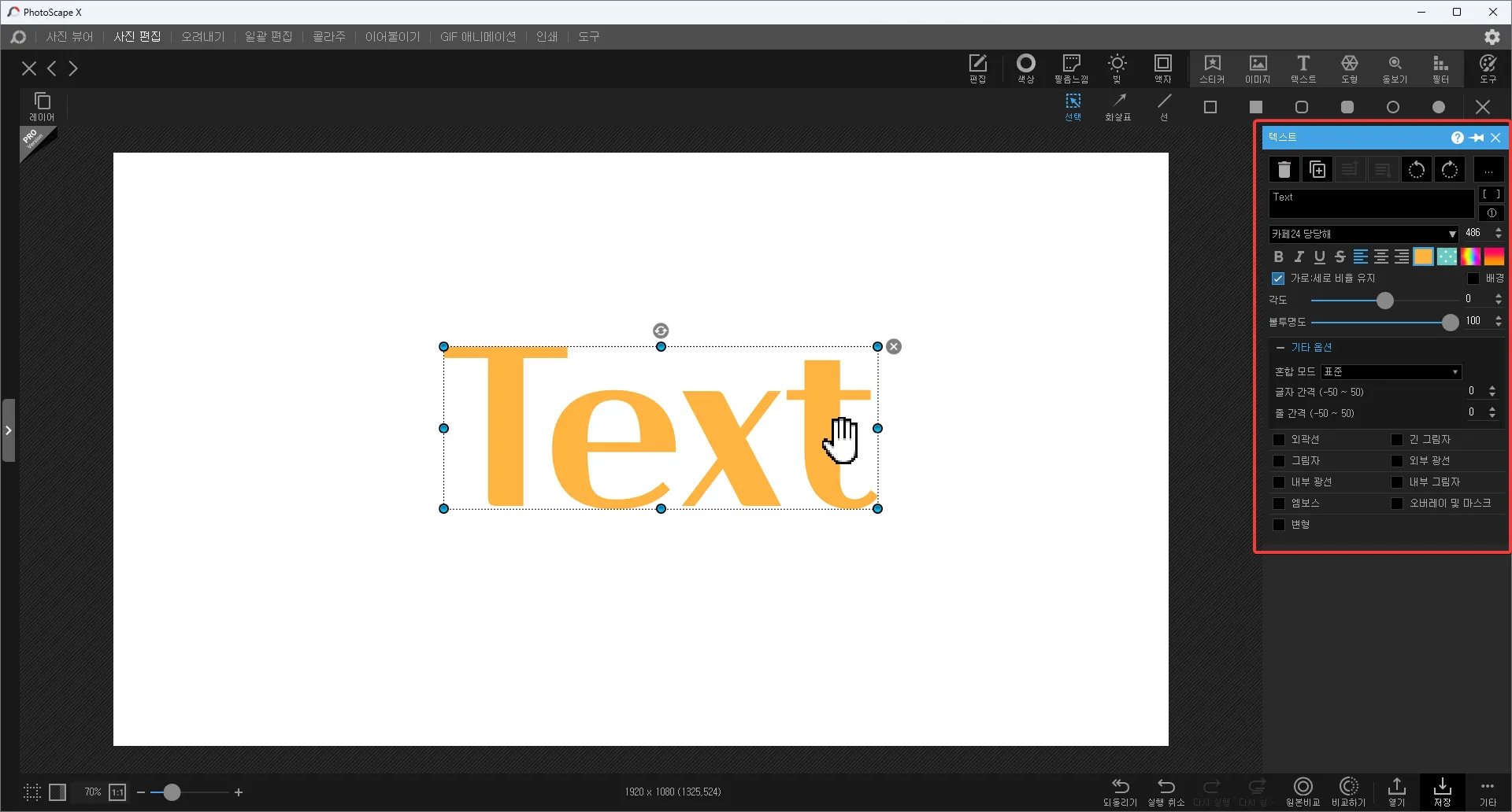 포토스케이프 x(photoscape x)에서 텍스트(text)를 추가해 보면 매우 많은 기능을 볼 수 있습니다.