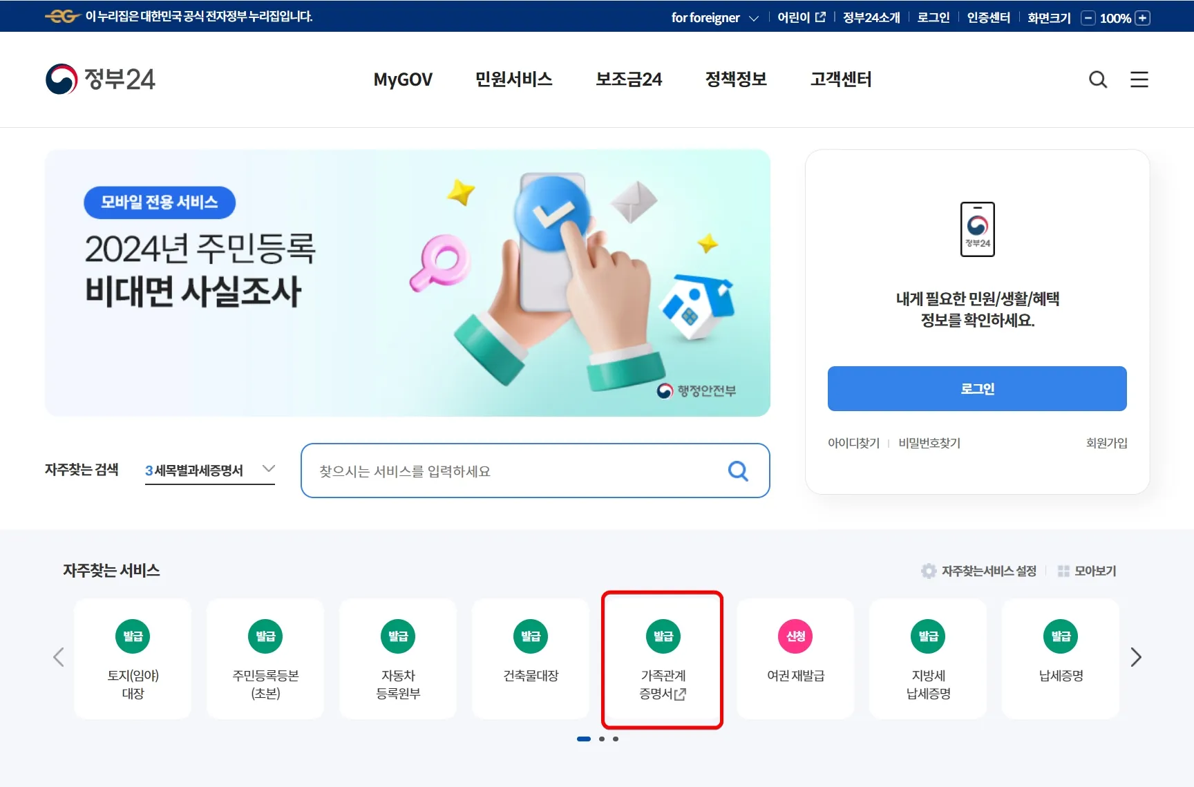 모바일 앱 사용자라면 '정부24(구 민원24)' 앱을 실행한 후 초기 화면의 '자주 찾는 서비스'에서 '가족관계증명서 발급'을 선택하면 '대한민국 법원 전자가족관계등록시스템'으로 연결됩니다.