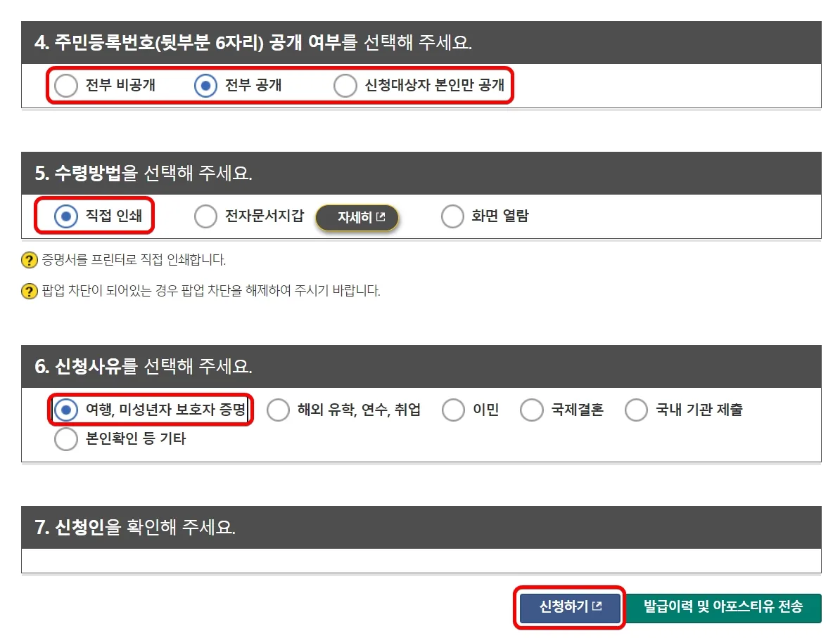 주민등록번호 뒤에 6자리는 공개, 수령방법은 직접 인쇄, 신청사유에 여행에 체크 한 다음 '신청하기'를 선택하시면 바로 출력할 수 있습니다.
