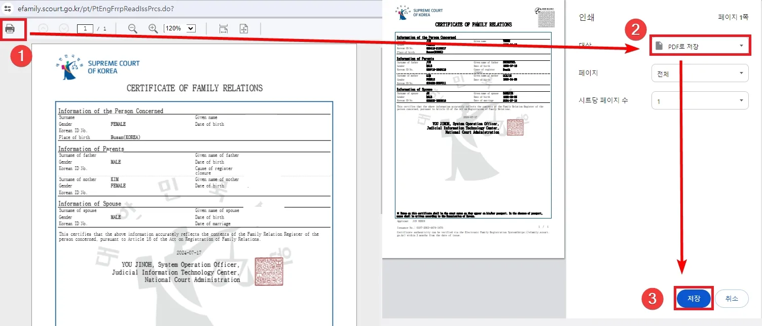 증명서를 출력할 수 있는 팝업창이 뜨면 좌측 상단에 있는 프린터 모양을 눌러서 대상을 프린터가 아닌 PDF로 저장을 선택하면 영문 가족관계증명서를 PDF 파일로 저장할 수 있습니다.
