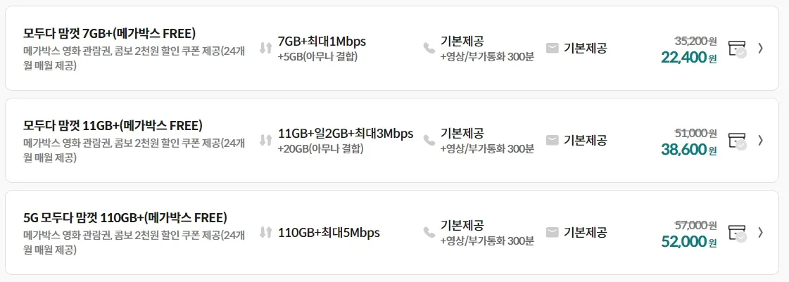 모두다 맘껏 7GB+(메가박스) : 월 22,400 원