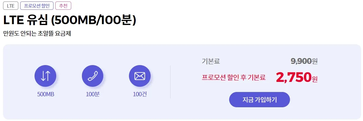 LTE유심(500MB, 60분), LTE유심(1GB, 50분) 요금제는 6개월 프로모션이 종료되면 가격이 변동되지만, LTE유심(500MB, 100분), LTE유심(1GB, 100분) 요금제는 해당 금액이 유지되는 평생 요금제로 이용하시는 것을 추천합니다.