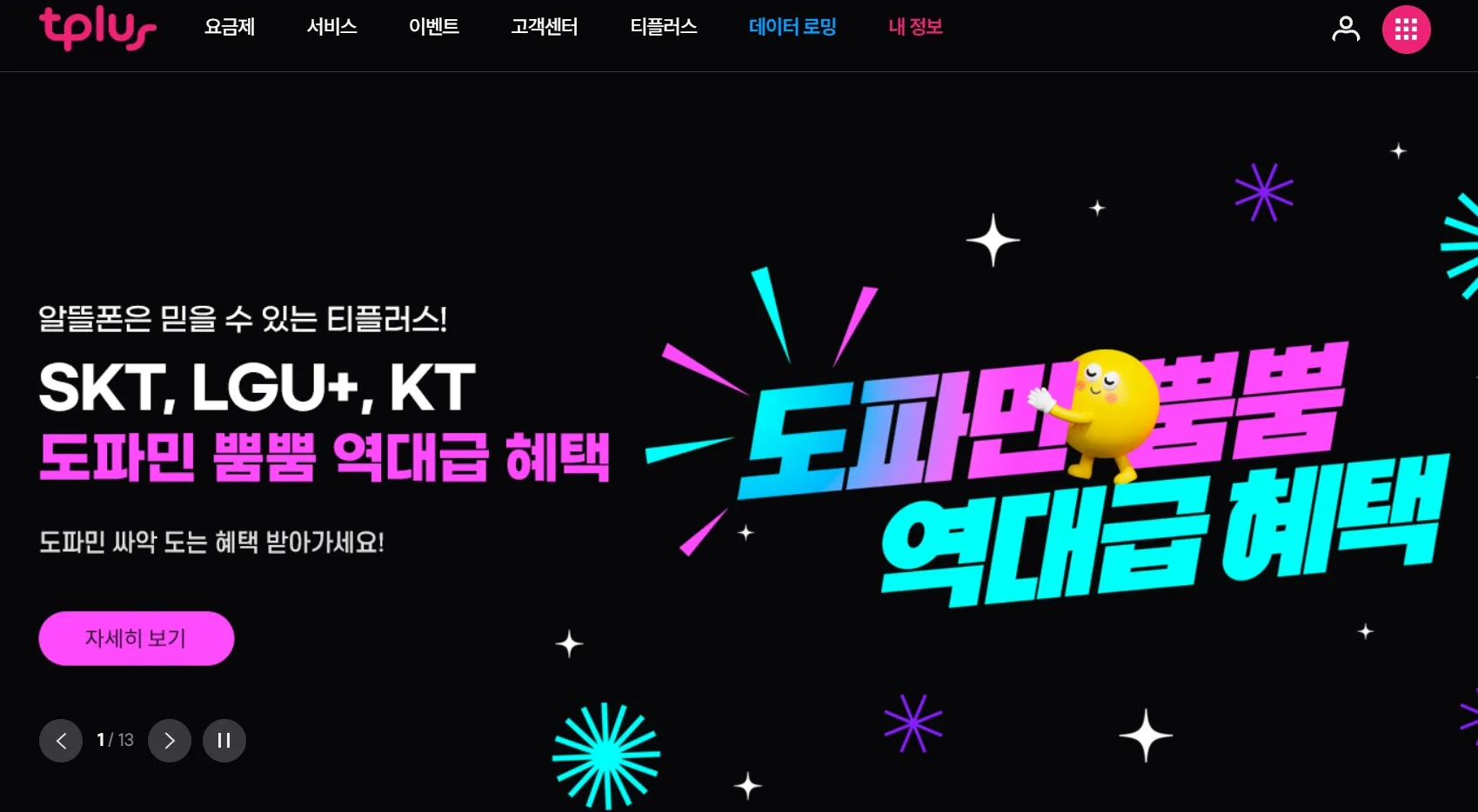 티플러스(Tplus)는 태광그룹 계열사인 한국케이블텔레콤에서 운영하는 알뜰폰 통신사로 SKT, KT, LG U+망을 모두 서비스하고 있습니다. 가입자 유치를 위해 일정기간 할인을 많이 해주는 이벤트 요금제도 많이 있습니다.