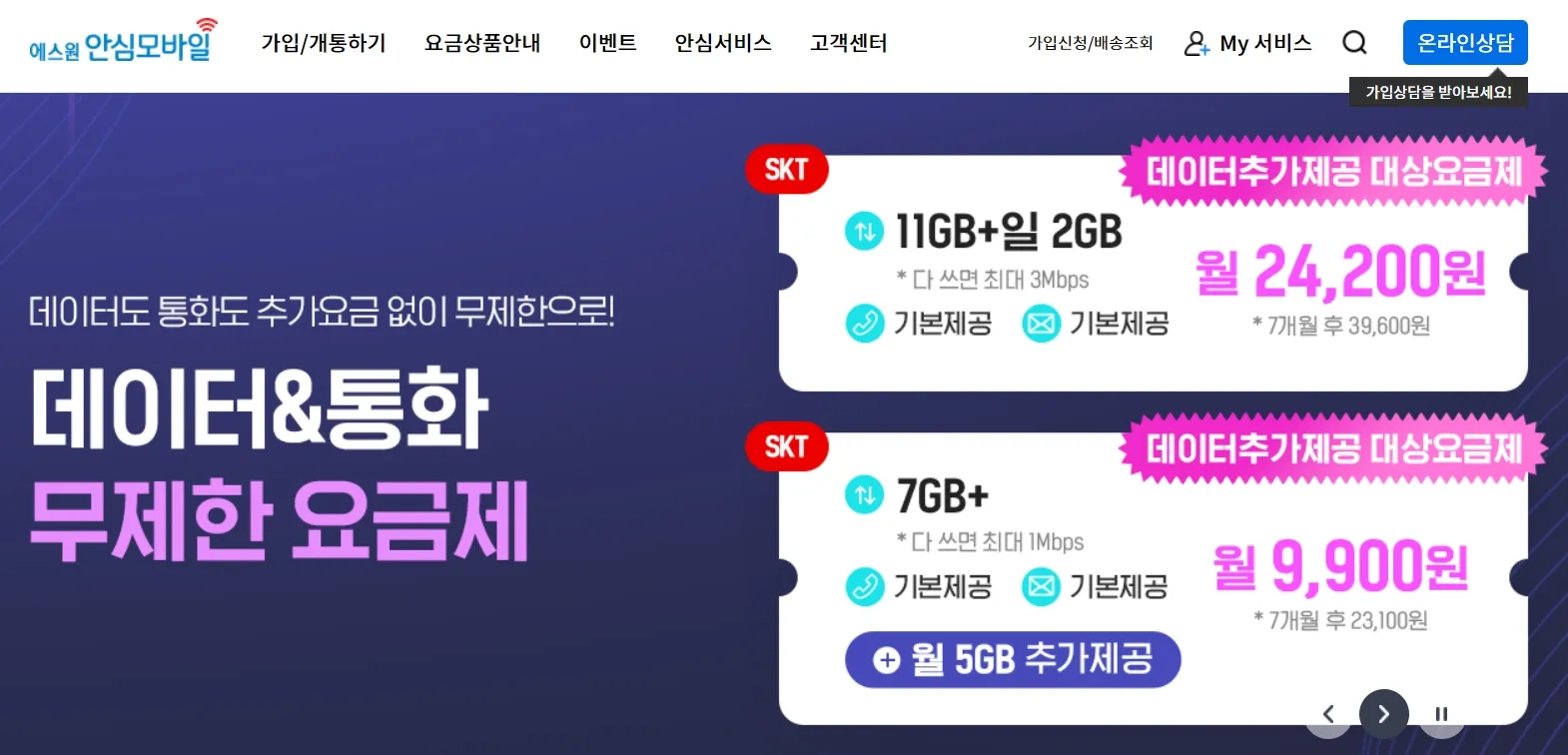 에스원 안심모바일은 삼성계열의 보안업체인 에스원에서 운영하는 알뜰폰 통신사로, 이통 3사 SKT, KT, LG U+망을 모두 서비스하고 있습니다. 가입자 유치를 위한 다양한 이벤트와 요금제가 준비되어 있습니다.
