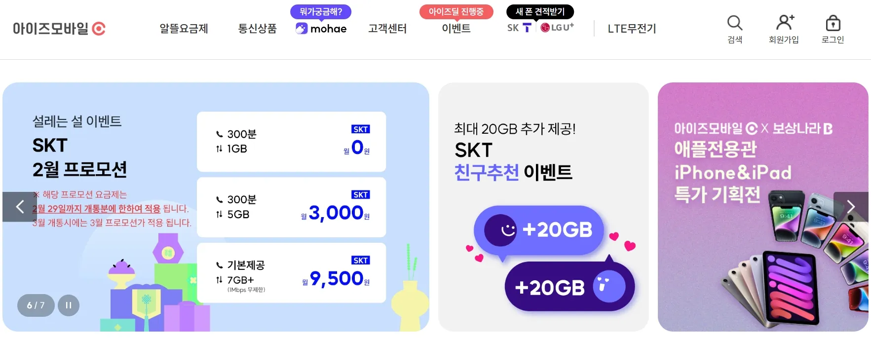 아이즈모바일은 이동통신 3사(SKT, KT, LG U+) 망을 서비스하는 알뜰폰 통신사로 일정기간 매우 저렴한 가격으로 이용할 수 있는 이벤트 요금제부터 평생 요금제까지 매우 다양하게 있습니다.