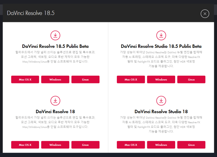 현재 정식 버전은 18.1.4와 베타 테스트 버전 18.5 가 있으며, 둘 중에 아무거나 다운로드해도 됩니다.