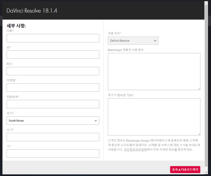 다빈치 리졸브 홈페이지에서 간단한 정보를 작성 후에 다빈치 리졸브(davinci resolve) 프로그램을 다운로드할 수 있습니다.