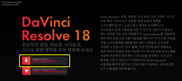다빈치 리졸브 스튜디오(davinci resolve studio)를 단독으로 구매하지 마시고, 블랙매직 디자인에서 판매하는 제품 중에 프로그램이 포함된 제품이 있습니다. 그것을 구매하시는 것이 효율적입니다.
