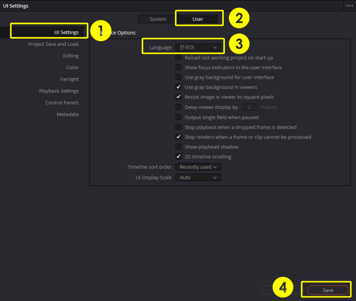 한국어로 설정하는 방법은 프로그램 좌측 상단에 있는 [DaVinci Resolve] - [Preferences..] - [UI Settings] - [User] - [Languge] - [한국어]로 설정하면 됩니다. 설정 저장 후 프로그램을 재실행하시면 한국어 메뉴를 사용할 수 있습니다.