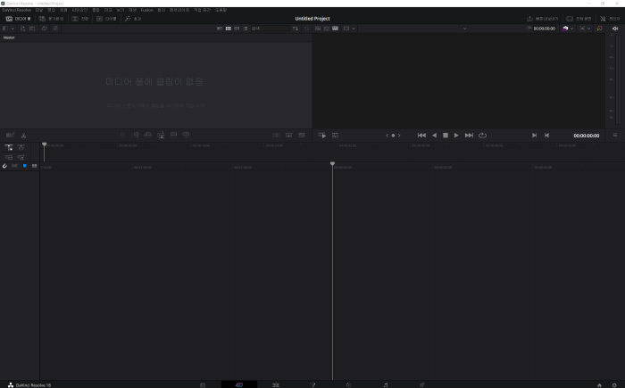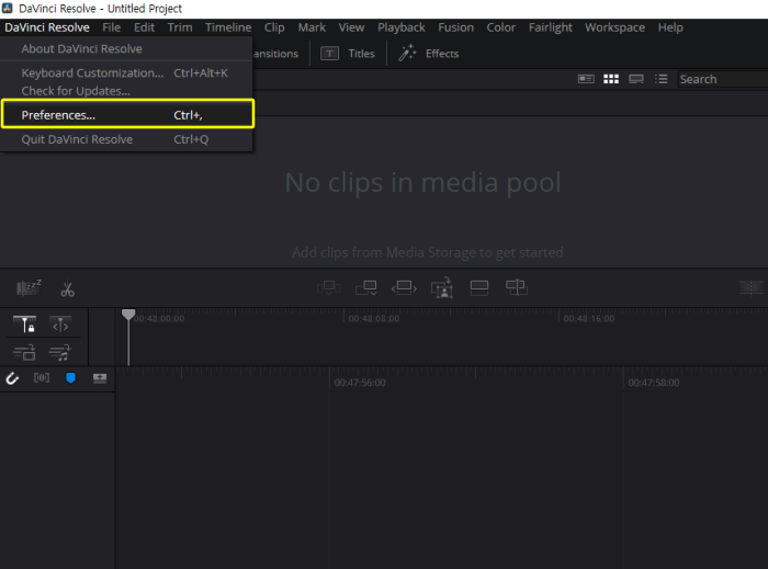 새 프로젝트(new project) 또는 이름 없는 프로젝트(untitled project)가 열리면, 프로그램 좌측 상단에 [DaVinc Resolve] 메뉴가 있습니다. 이 메뉴를 선택하면 아래에 [Preferences..] 메뉴가 있습니다.