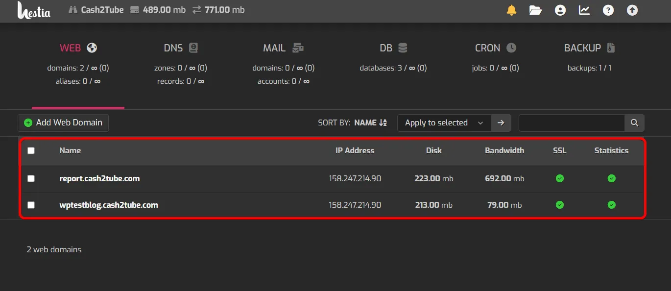 HestiaCP에서 사용자 Cash2Tube 하면 현재 2개의 도메인이 연결된 상태입니다. Cash2tube.com의 루트 도메인은 현재 티스토리에 연결되어 있어서, 하위 도메인만 보입니다.