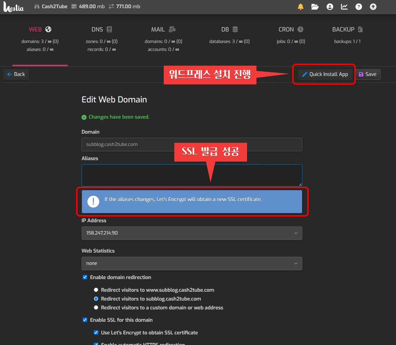SSL 인증서 발급이 끝났으니, "Quick Install App"을 눌러서 워드프레스 또는 필요한 프로그램 설치를 진행하면 됩니다. 워드프레스 설치 과정은 이전 포스팅에서도 다룬 내용이라서 이번 포스팅에서는 생략하겠습니다.