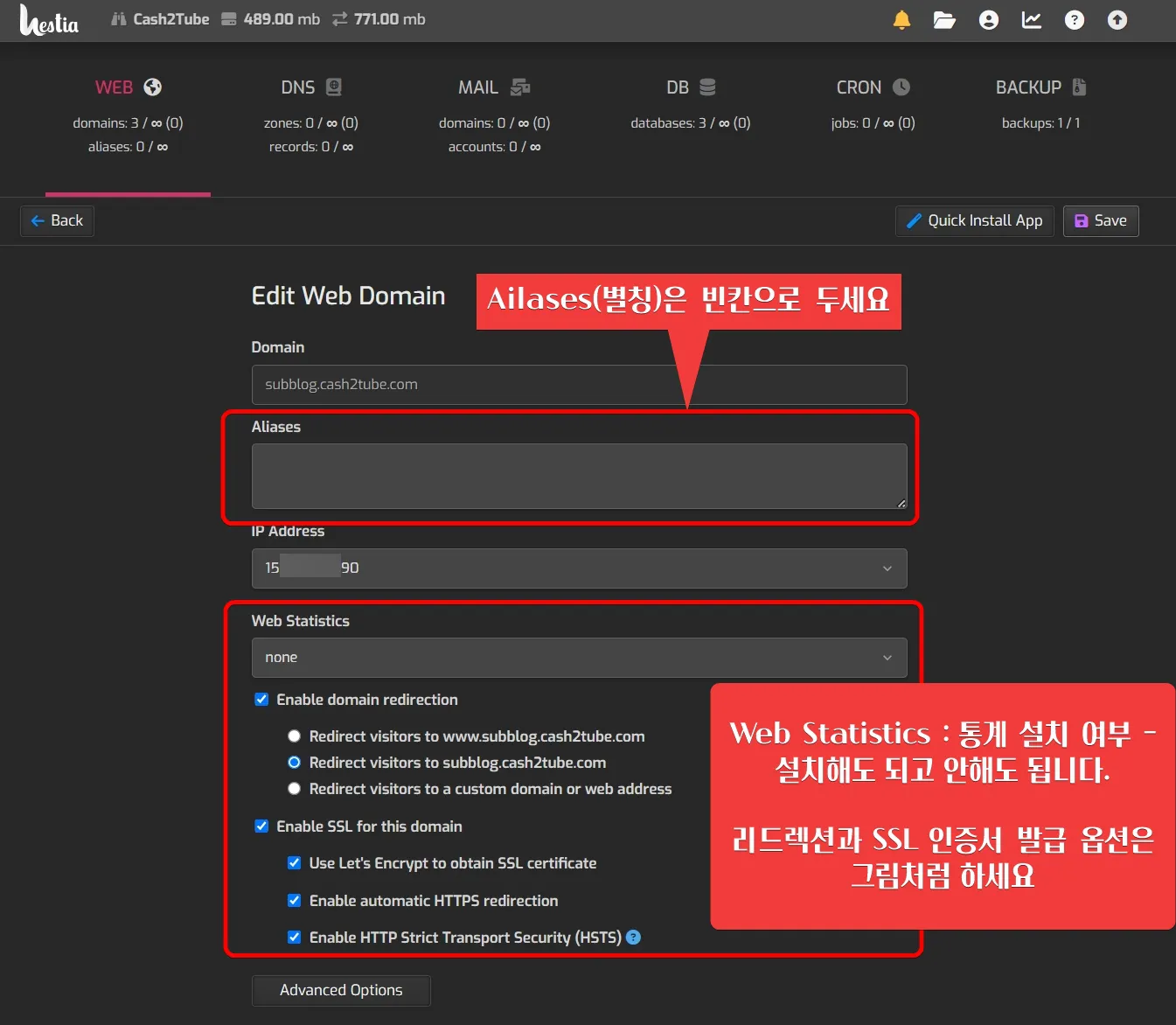 별칭(Ailases)은 빈칸으로 두세요. 그리고, 통계를 사용하려면 "Web Statistics"을 설치하세요.