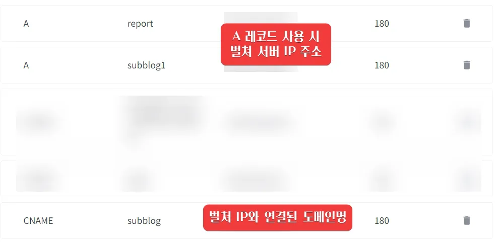 물론, 하위 도메인 연결 시 A 레코드를 사용해도 되지만, 가능하면 하위 도메인은 CNAME 레코드를 사용하는 것을 권장합니다.
